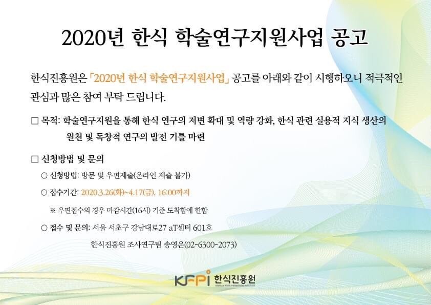 2020년 한식 학술연구 지원 공모는 4월 17일 마감되었다. 한식 연구의 저변을 확대하고 실용적 지식 생산의 원천과 연구 이론 발전의 기틀을 마련할 과제는 어떤 것일지, 그 결과를 기다려보자.