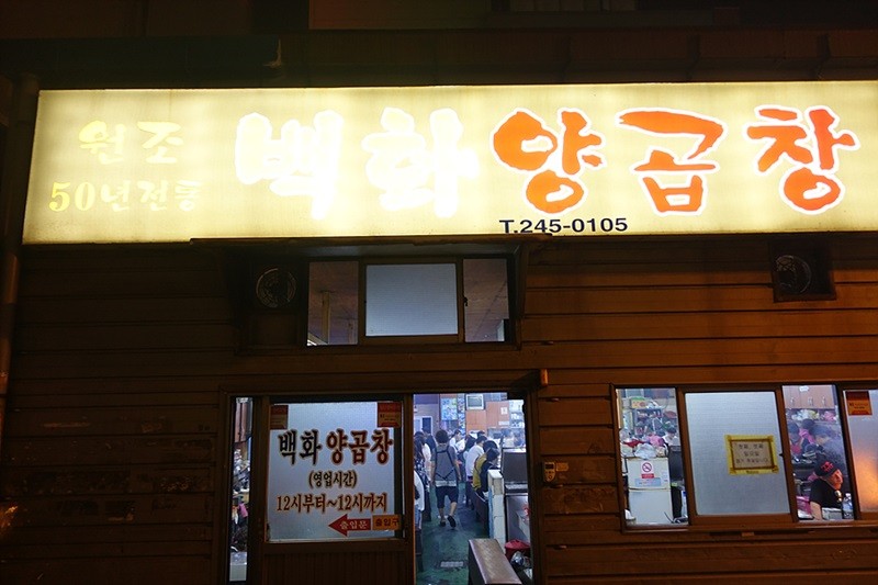 그 중 가장 유명한 <백화 양곱창>은 1959년 개업했다. '백화수복'할 때 그 '백화'다. 현재 롯데주류의 전신인 백화의 후원으로 ‘양곱창 광장’이 문을 열었다. 한 공간에 열 개 남짓 가게들이 신림동 순대타운 같은 형태로 구획지어 성업하고 있다.