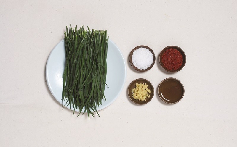 ➊ 부추는 다듬어 씻어 물기를 빼고 길이를 반으로 썰어서 멸치액젓으로 절인다.