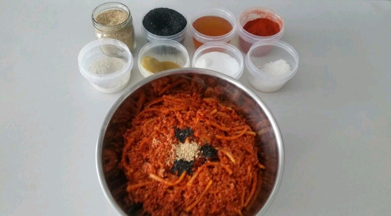❼ 5와 6을 혼합한 뒤 나머지 양념을 모두 섞어준다. 간을 보고 그릇에 꼭꼭 눌러 담아 실온에서 숙성시킨다.