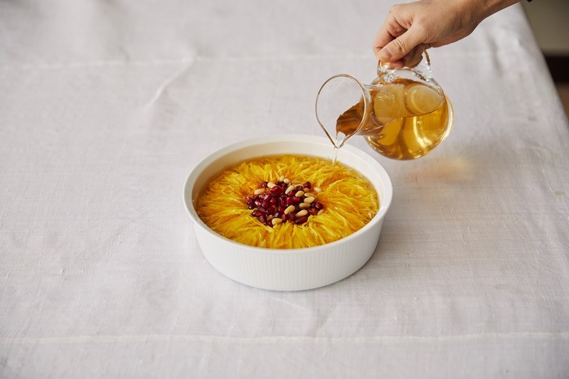 20여 년 전 궁중음식연구원에서 처음 접한 후, 유자가 열리는 겨울마다 만드는 디저트다. 유자의 겉껍질을 얇게 벗긴 후, 껍질의 노란 부분과 흰 부분을 분리해서 각각 가늘게 채 썬다. 그릇에 배채와 유자채를 돌려 담고, 가운데엔 석류알과 잣으로 멋을 낸다. 여기에 희석한 유자 시럽을 부어내면 완성이다. 정성이 듬뿍 들어간 섬세한 음식이다. 경기 음식은 어떤 지역의 음식보다 섬세하다는 점을 보여주고 싶었다.