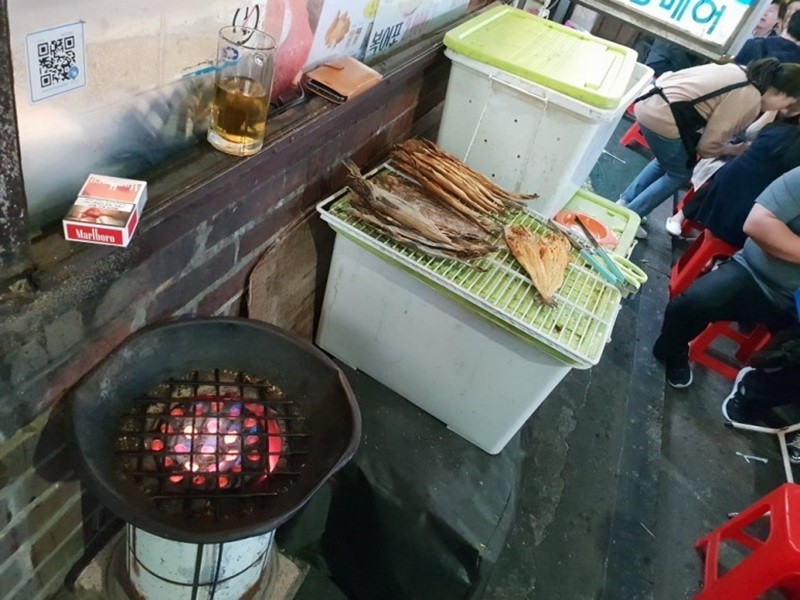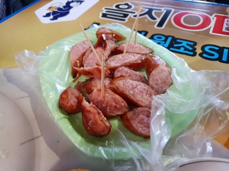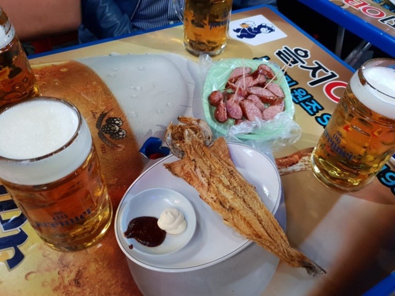 생맥주는 한 잔에 3천원, 노가리는 천원이다. 골목을 방문한 이라면 누구나 가볍게 한 잔 할 수 있어 인기가 높다. 가격도 저렴하고, 날씨 좋으면 매일 수 천 명의 눈 먼 손님들이 방문하니 노가리든 맥주든 아무렇게나 되는대로 낼 것 같은데, 이곳의 노가리는 다른 집들보다 품질이 좋다. 호기롭게 맥주를 몇 모금 넘기고 연탄불에 구운 노가리를 씹어보자. 중간 중간 땅콩을 입 하나씩 털어 넣어 함께 씹어보면 또 다른 매력을 느낄 수 있다. 짭짤한 수입 소시지도 이 집만이 가지고 있는 필수 주문 메뉴.