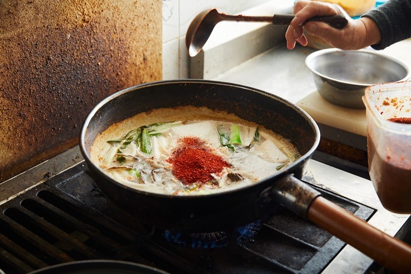 은근한 불에 끓이면 끓일수록 국물 맛은 더 깊어진다. 참게와 채소가 뿜어낸 시원한 국물 사이로 톡톡 씹히는 보리새우의 식감이 재미있다. 탕 속에 빠진 수제비를 건져 먹는 재미도 쏠쏠하다. 얼큰한 국물과 쫀득한 수제비는 환상의 짝꿍이다. 주인공인 참게는 두말할 나위 없다. 작은 등껍질 하나를 건져 수저로 긁으면 주홍빛 알과 내장이 묻어나온다. 달달하고 쫀득한 맛이 입안 가득 퍼진다.