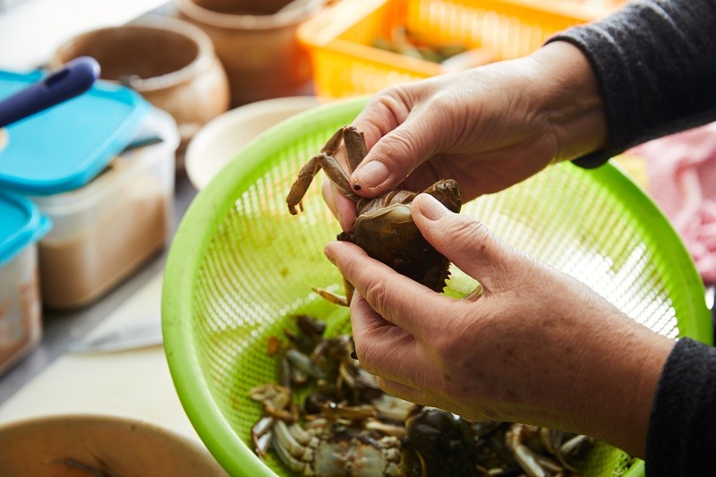 참게 몸통과 다리를 건져 잘근잘근 씹으면