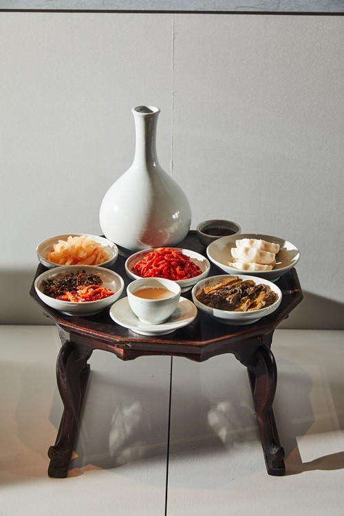 육회, 북어대강이, 가물치회, 만두, 참죽나무․토란 줄거리, 과주 등이 차려져 있다. 바다와 근접하지 않은 청주는 바다 생선 대신 민물에서 잡히는 가물치를 회로 먹었다. 좋은 술에 빨아서 아랫목에 덮어두었다가 발효시켰다. 육회도 좋은 술에 빨아서 꿀과 고추장을 넣어 무쳐 먹었다. 술에 빨면 살균 효과가 있으며, 육질이 부드러워지는 효과가 있다. 조상의 슬기를 엿볼 수 있는 대목이다.