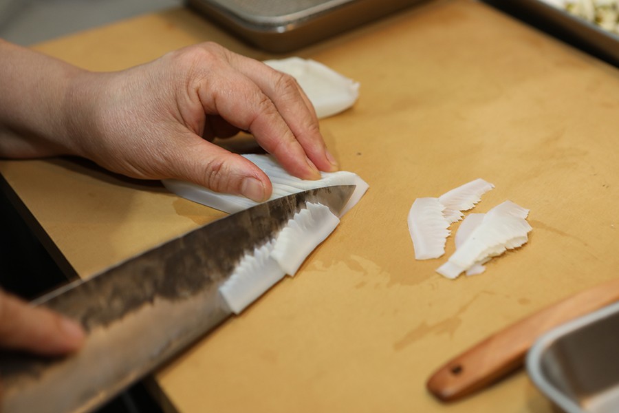 ② 갑오징어 껍질을 벗기고 칼집을 넣어 끓는 소금물에 약 1분가량 데쳐서 식힌 후 얇게 썬다.