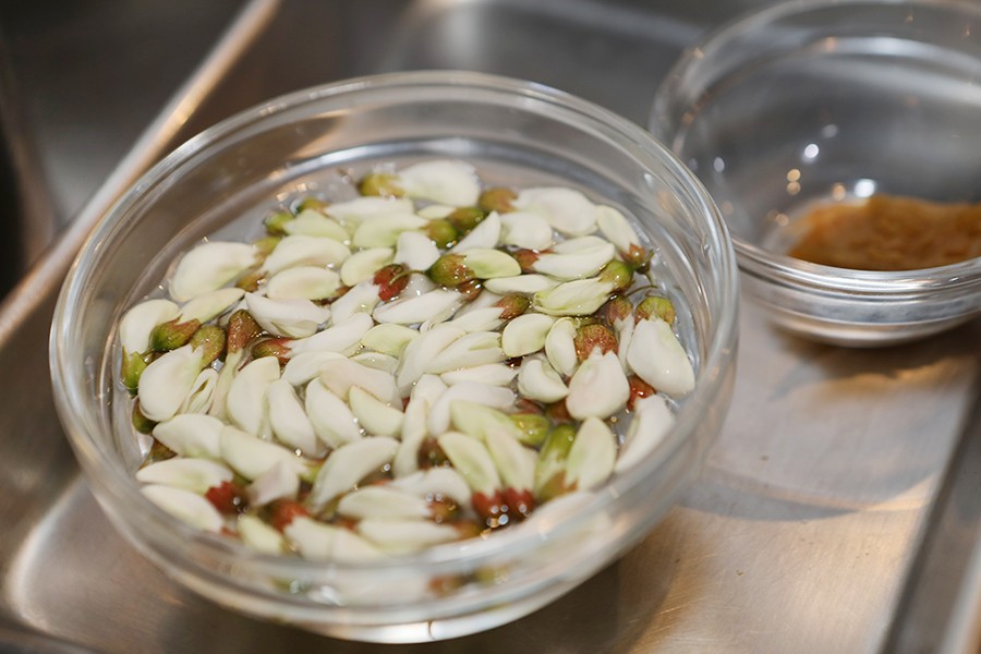 ① 식초를 탄 물에 아카시아 꽃을 30분가량 담가두었다가 가볍게 씻어 물기를 뺀다.