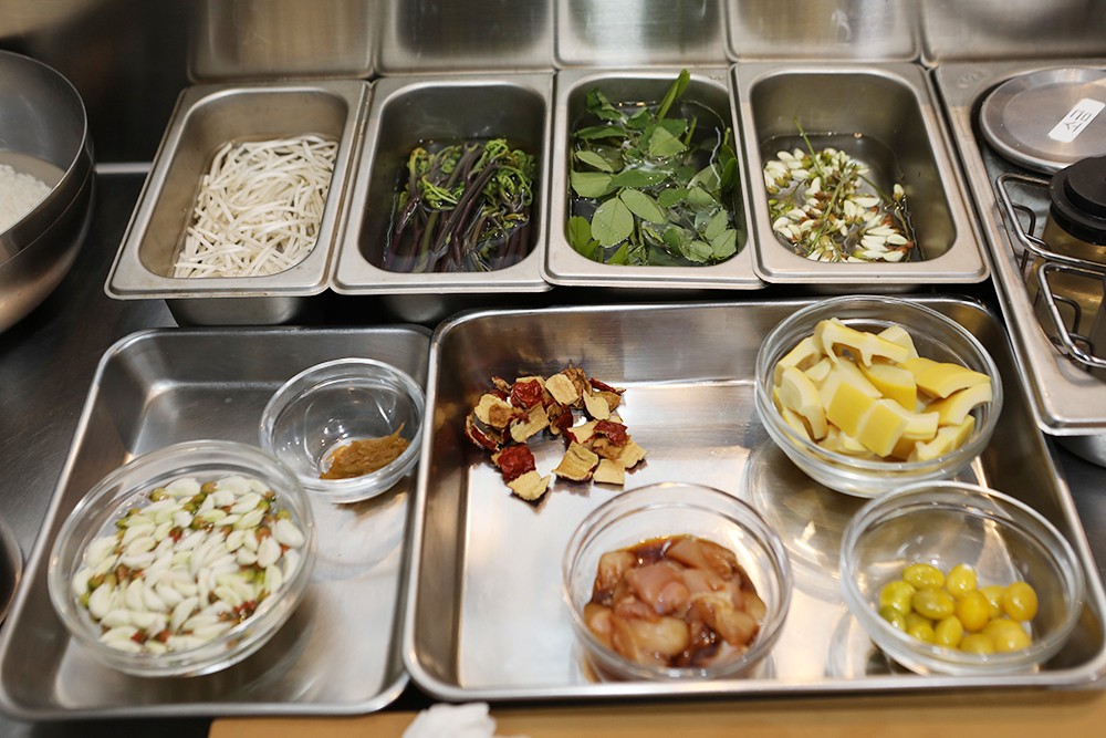 생죽순, 불린 찹쌀, 닭다리살, 은행, 대추, 햇고사리, 숙주, 대파, 우리 밀가루, 멸치육수를 준비한다.