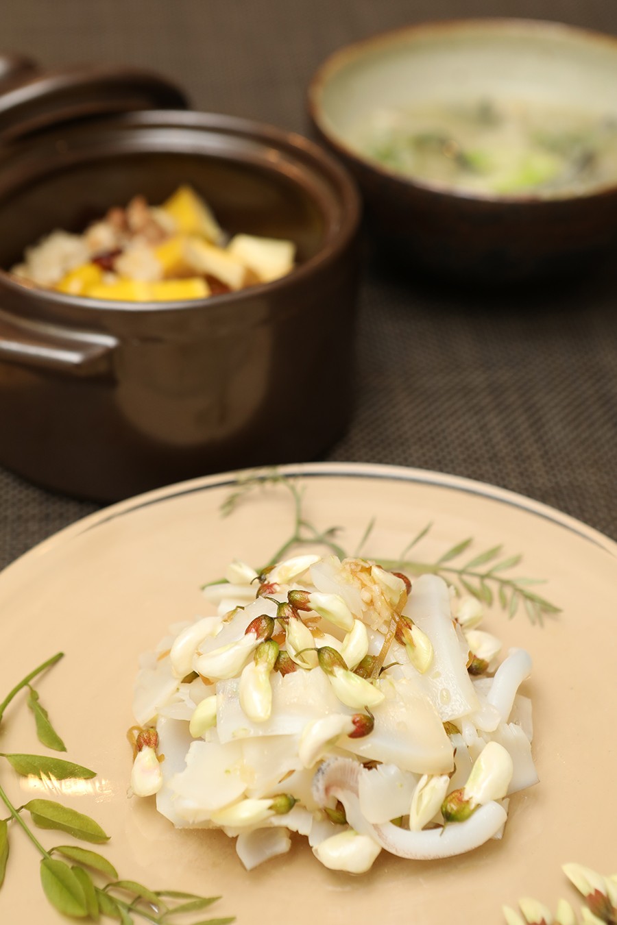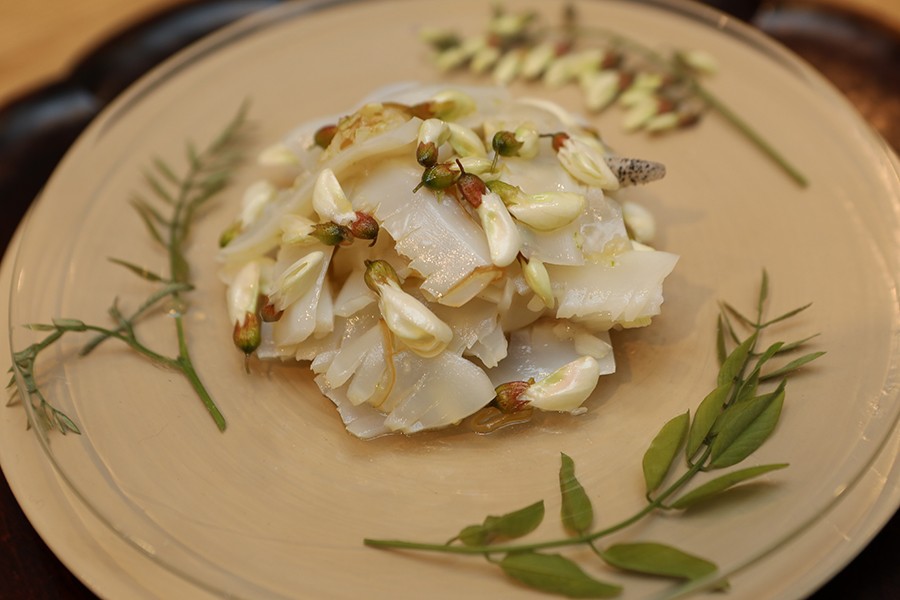 매실청으로 맛을 낸 아카시아 꽃과 갑오징어 냉채