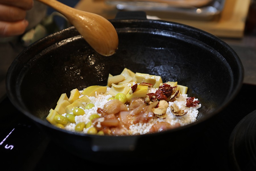 ⑤ 멸치육수에 집 간장, 소금으로 간을 맞춘 후 끓어오를 때 ④를 넣고 떠오르면 간을 맞춰 그릇에 담아 죽순 영양밥과 함께 낸다.