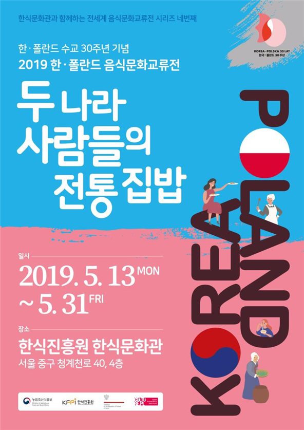 한식진흥원 한식문화관은 ‘전세계 음식문화교류전’을 지속적으로 열고 있다. 한국-터키의 첫 교류를 시작으로, 아일랜드, 스웨덴에 이어, 지난 5월 13일 한국과 폴란드 수교 30주년 기념 ‘2019 한·폴란드 음식문화교류전’이 네 번째 포문을 열었다. 따로 또 같이, 두 나라의 음식문화를 체험할 수 있는 특별한 경험을 선사한다. 개막식을 시작으로 5월 31일까지 일반 관람객을 대상으로 ‘한국, 폴란드 양국의 대표 전통음식과 식기류, 사진‧영상물 전시’도 열린다.