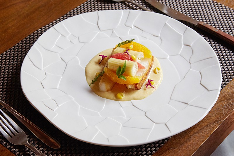 <초당옥수수 퓌레와 속을 채운 리가토니 광어구이>