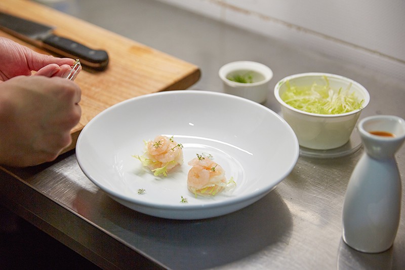 ④ 접시에 해산물을 올리고 가스파초를 곁들인다.