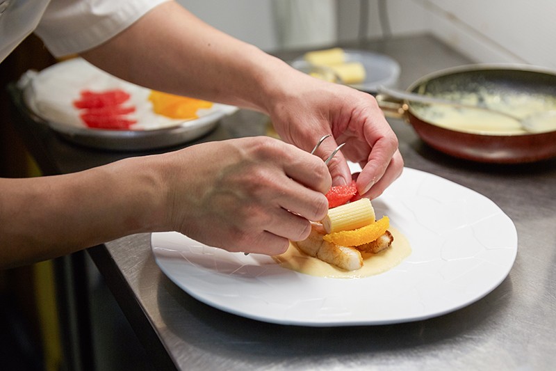 ➅접시에 퓌레를 깔고 생선, 오렌지, 리가토니를 곁들인다.