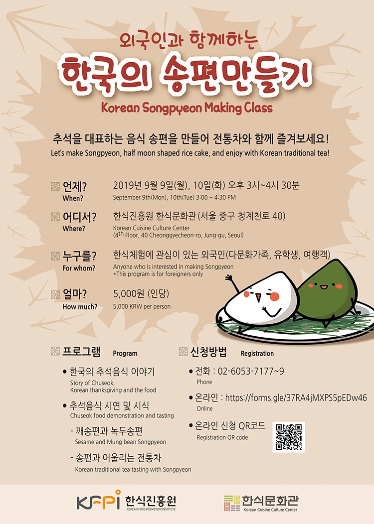 우리나라의 5대 명절 중 하나인 추석을 맞이하여 9월 9일(월), 10일(화) 양일간 한식진흥원 한식문화관에서 외국인을 대상으로 특별한 쿠킹클래스가 열린다. '외국인과 함께하는 한국의 송편만들기'라는 주제로 추석을 대표하는 음식인 송편을 만들어보는 시간을 가진다.