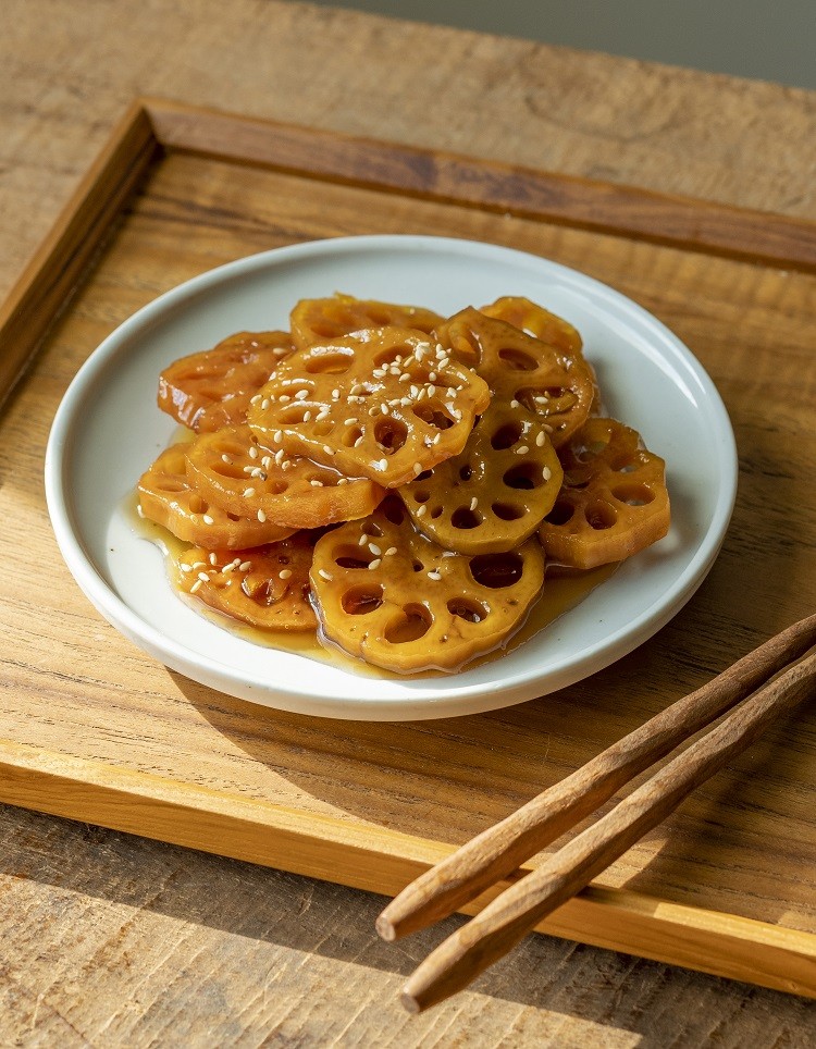 화려하게 꽃을 피우는 연꽃을 기운차게 받치고 있는 뿌리. 예부터 귀중하게 여겨 약재로도 사용되어온 연근은 위벽을 보호하고 소화를 촉진하며, 해독 작용이 뛰어나다. 껍질을 벗긴 연근은 끓는 물에 데쳐 내 찬물에 헹군 다음, 연근과 간장을 넣고 재료가 잠길 정도로 물을 부어 서서히 졸인 후에 통깨를 뿌려 낸다.