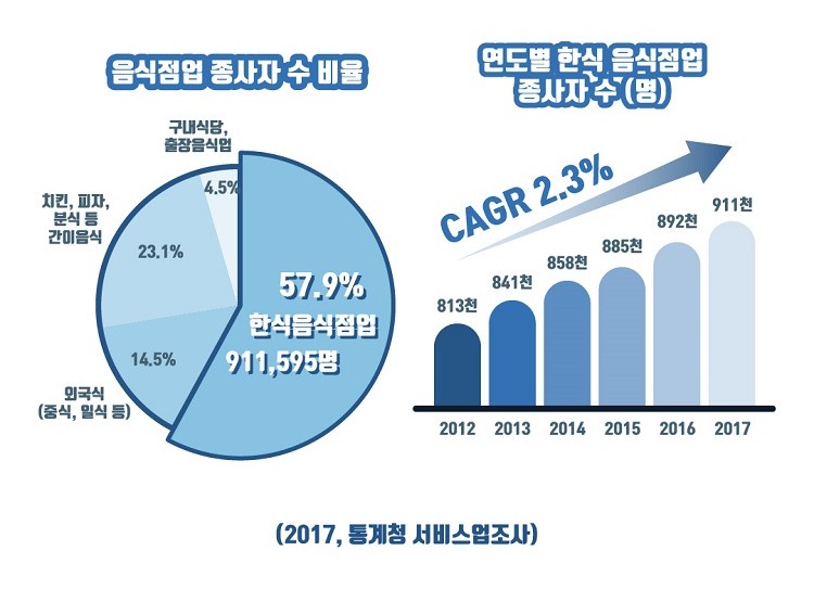 2017년 기준 한식음식점업의 종사자 수는 911,595명으로 음식점업 전체 종사자 수의 57.9%를 차지하였다. 이는 통계청 표준산업분류 기준으로 음식점업의 과반수가 한식음식점업에 종사함을 의미한다. 한식업의 종사자 수는 연평균 약 2.3% 성장하였으며 2012년 대비 97,852명이 증가하였다.