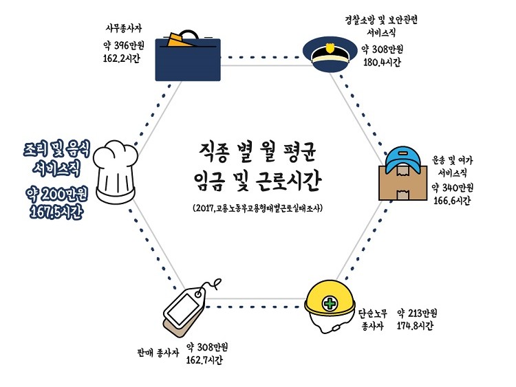 한식음식점업의 낮은 노동생산성은 한식음식점업의 노동력 구조 특성 때문에 기인한 것으로 보인다. 한식음식점업의 대부분 직종을 차지하는 조리 및 음식서비스직은 타 산업보다 저임금, 고강도 노동구조의 특성을 가지고 있다. 고용노동부의 고용형태별 근로실태조사에 따르면 조리 및 음식서비스직의 월 평균 급여는 약 200만원으로 가장 낮았고, 노동투입 시간도 월 평균 167.5시간으로 가장 높았다.