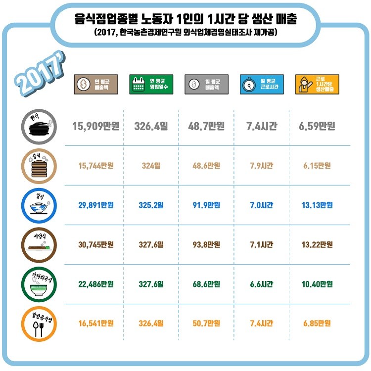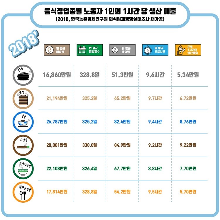 한식음식점업의 노동투입 대비 산출을 계산하여 노동생산성을 살펴보면, 타 음식점업종에 비해 낮은 편인 것으로 나타났다. 노동의 투입은 근로자의 일평균 근로 시간으로 보았고 산출은 일평균 매출액으로 보았다. 즉 노동생산성을 노동자 1인이 1시간 당 생산하는 매출로 비교하였다. 한식음식점업은 2018년 기준 평균 5.34만원인 것으로 나타났다. 반면에 음식점업종 중 가장 생산성이 높은 업종은 서양식음식점업(9.22만원)으로 나타났다.