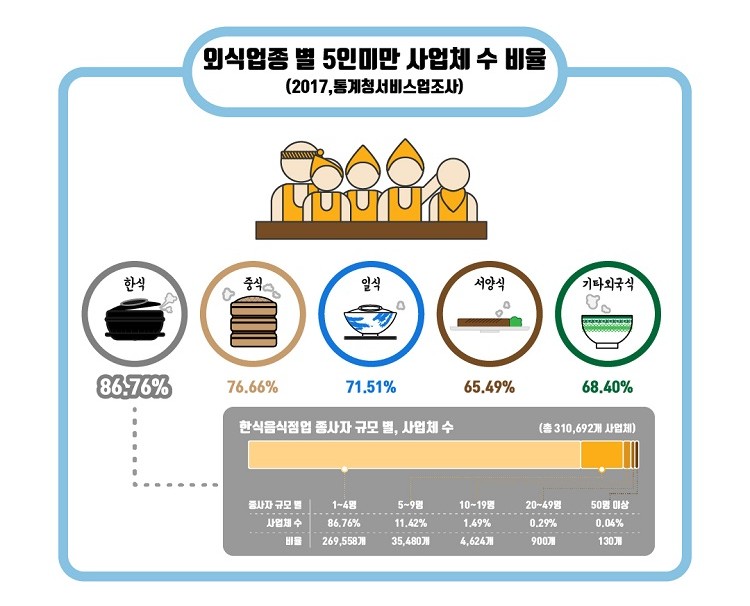 종사자 규모별로 한식음식점업을 살펴보면, 1~4명 규모의 업체가 86.76%를 차지하였다. 이는 음식점업 내 타 업종보다 높은 비율을 나타내는데, 일식과 중식의 경우 각 71.51%, 76.66%를 차지하는데 반해 한식은 80%가 넘는 비율을 차지한 것이다.