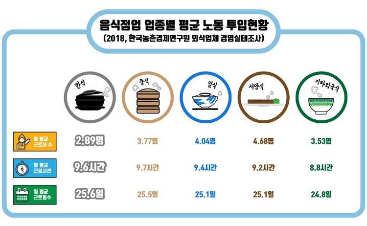 이러한 한식음식점업의 고강도 노동력 특성은 음식점업 내에서 비교해 볼 때도 나타난다. 한식음식점업의 월 평균 근로자 수는 2.89명, 일 평균 근로시간은 9.6시간, 월 평균 근로일수는 25.6일로 나타났다. 음식점업 내 다른 업종과 비교해 보면 월 평균 근로자수는 업종 중 가장 낮았고 일 평균 근로시간과 월 평균 근로일수는 업종 중 가장 높았다. 이를 통해 볼 때 한식음식점업은 다른 외식업종보다 상대적으로 더 적은 인원으로 더 많은 근로를 시킨다고 볼 수 있다.