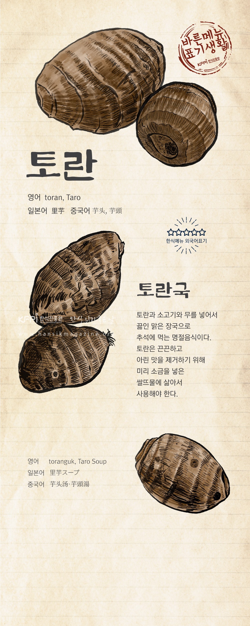 This clear soup is made by boiling taro root with beef and radish and is eaten during the Chuseok (Korean Thanksgiving) holidays. To remove its acrid flavor and slimy texture, taro root should be cooked in salted rice water.