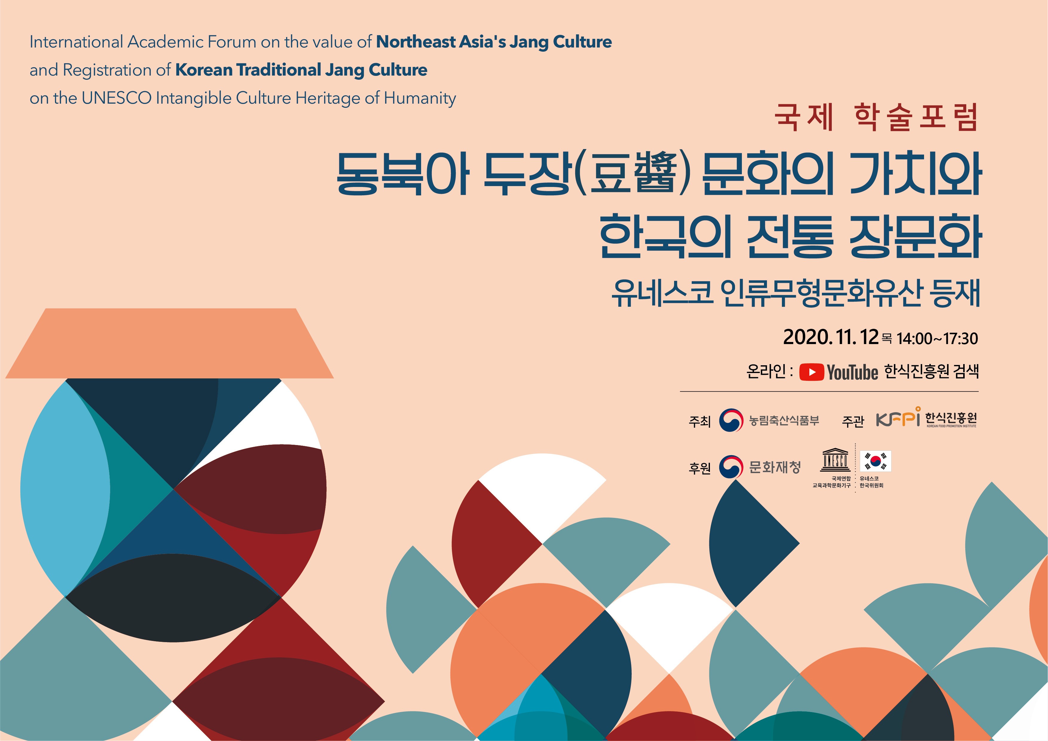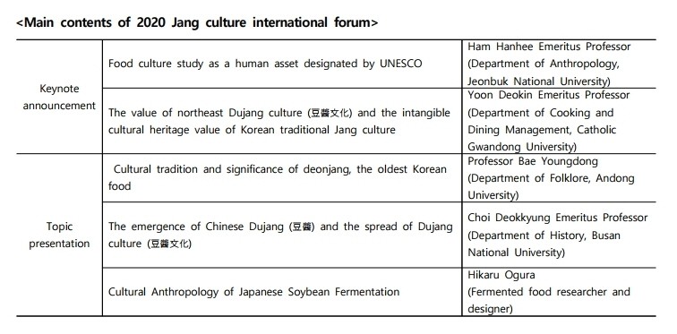 Ministry of Agriculture, Food and Rural Affairs and the Korean Food Promotion Institute are trying to spread the Korean traditional Jang culture, and are promoting the intangible cultural heritage registration of humanity by UNESCO. As part of this effort, the two organizations will broadcast online international academic forums on 'The Value of Northeast Asian Dujang Culture and the Registration of Korean Traditional Jang Culture as UNESCO Intangible Cultural Heritage' at 2 pm on November 12th(Thur)