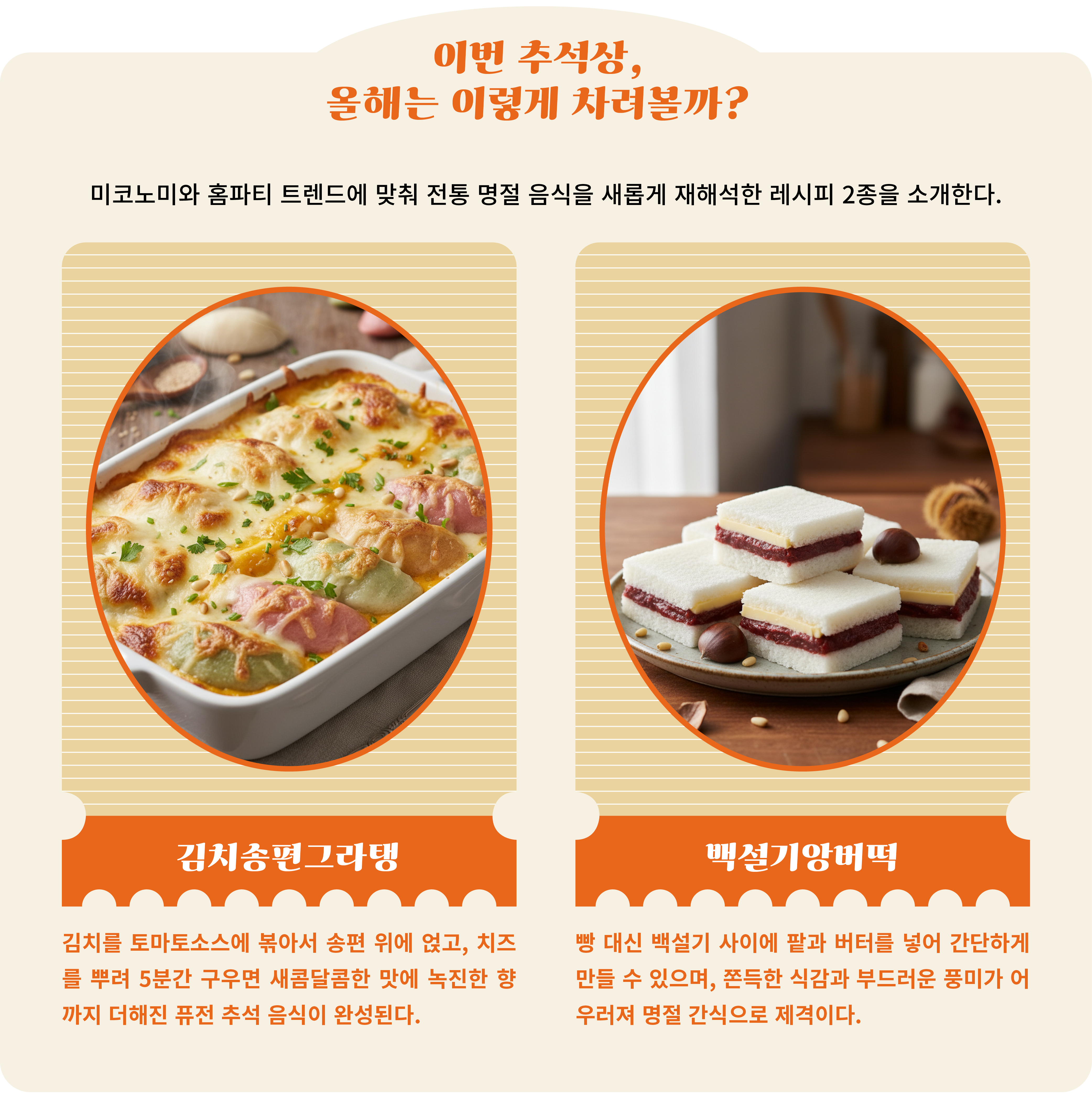 오늘날의 추석상은 전통과 변화가 공존하는 무대다. 혼추족의 간편식, 나를 위한 프리미엄 메뉴, 가족, 지인과 즐기는 홈파티 음식까지, 각자의 삶과 가치관에 따라 다양하게 펼쳐지고 있다. 모습은 달라졌지만 음식이 지닌 본질적인 의미는 여전하다. 추석 밥상은 여전히 명절을 더욱 풍성히 채우고, 우리의 유대를 돈독히 하고, 나를 채우는 매개가 되기 때문이다. 수많은 변화 속에서도 이어지는 이 가치는 앞으로도 추석상을 더욱 정겹고 또 특별하게 만드는 힘이 될 것이다.