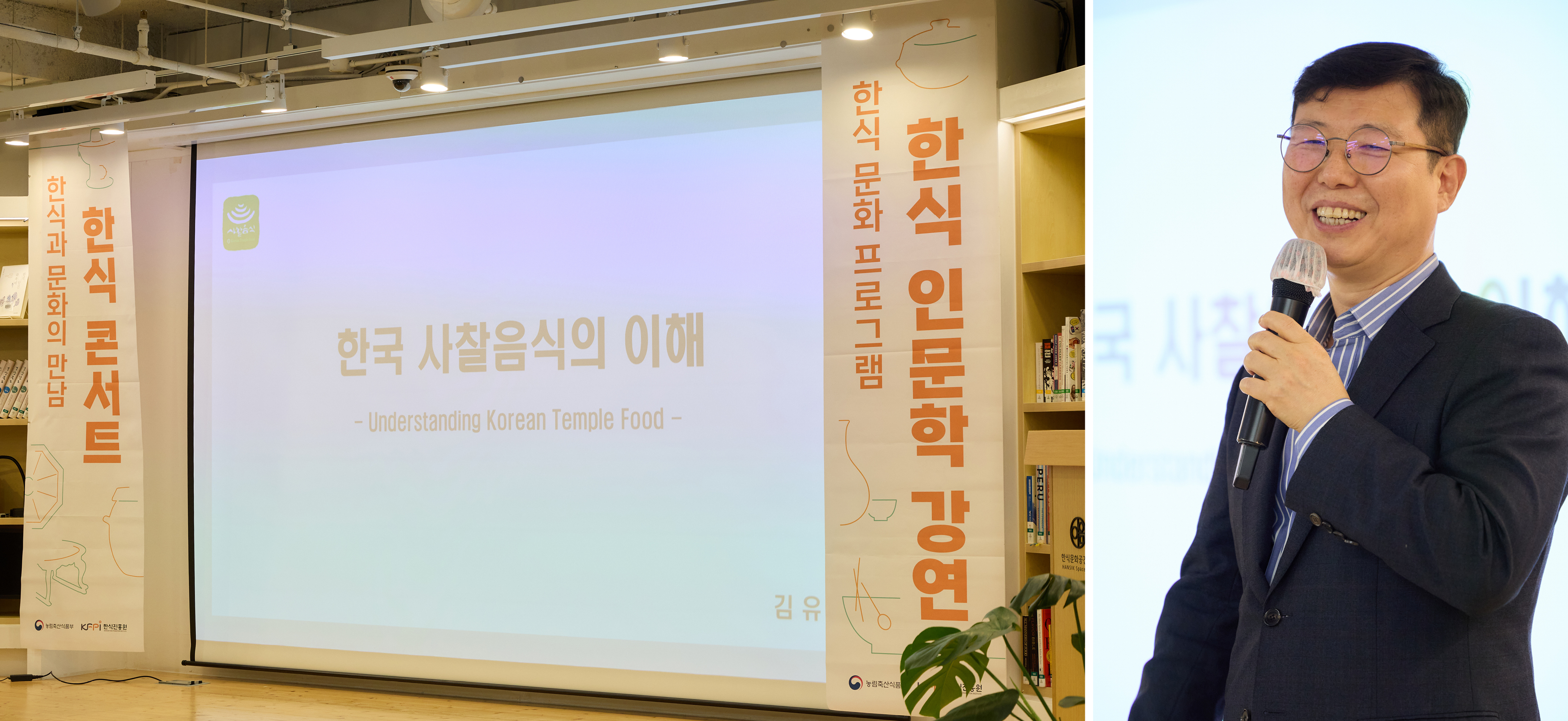 이어 사찰음식의 역사와 특징을 풀어내면서 “사찰음식은 단순히 채식을 실천하는 방식이 아니라, 음식을 바라보는 관점을 바꾸는 데 본질이 있습니다”라고 강조했다. 객석에서는 고개를 끄덕이며 경청하는 모습이 이어졌다. 강연 중에는 질의응답이 활발히 오갔고, 경품 추첨까지 더해져 한층 화기애애했다. 김 연구위원은 “21세기를 살아가는 우리에게 무엇을 어떻게 먹을 것인가를 다시 생각해 보는 계기가 되었기를 바란다”는 말로 강연을 마무리했다.