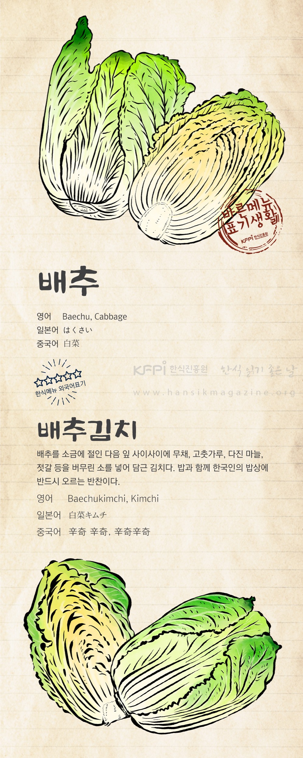 Salted Napa cabbage stuffed with a mixture of julienned white radish, red chili powder, minced garlic, and salted fish. Along with rice, kimchi is a required dish with every Korean meal.
