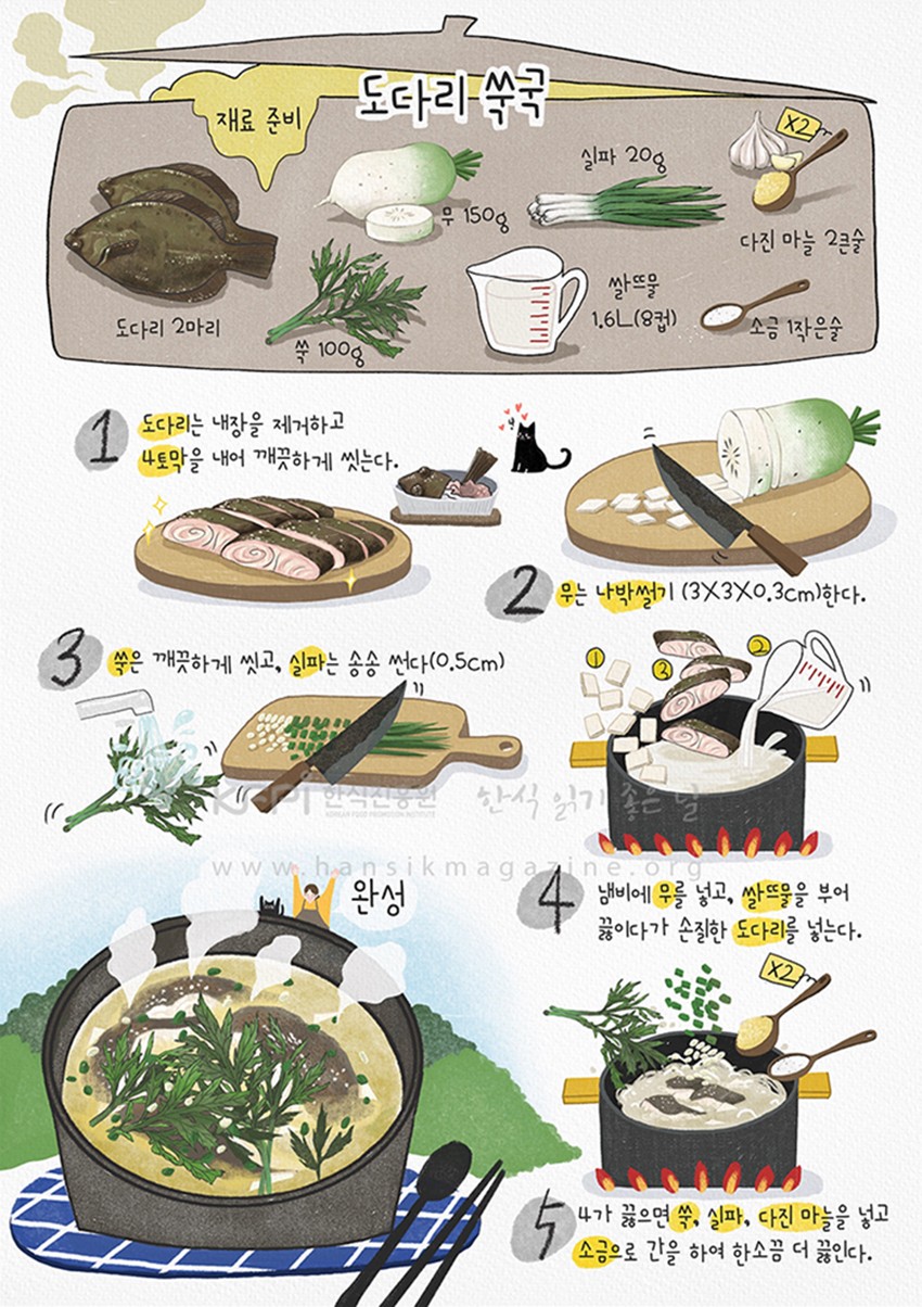 2 of dodari(flounder), radish 150g, mugwort 100g, green onion 20g, rice water 1.6L(8 cups), 2 tablespoon of minced garlic, 1 teaspoon of salt