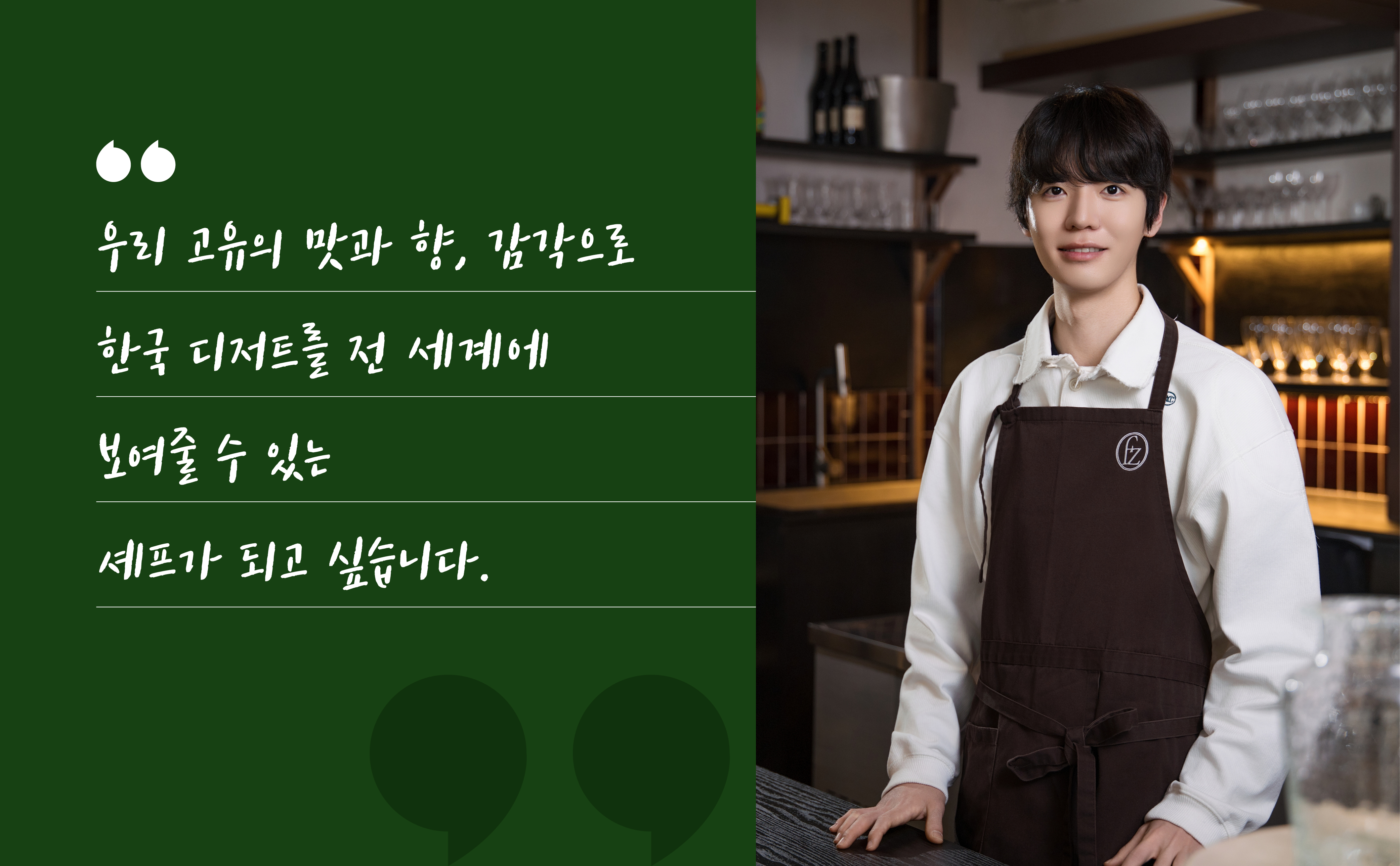 저 또한 저만의 방식으로 한국의 디저트에 다양한 시도를 거듭해 나갈 예정입니다. 우리 고유의 맛과 향, 감각을 세계에 보다 잘 보여줄 수 있는 셰프가 되고 싶습니다.
