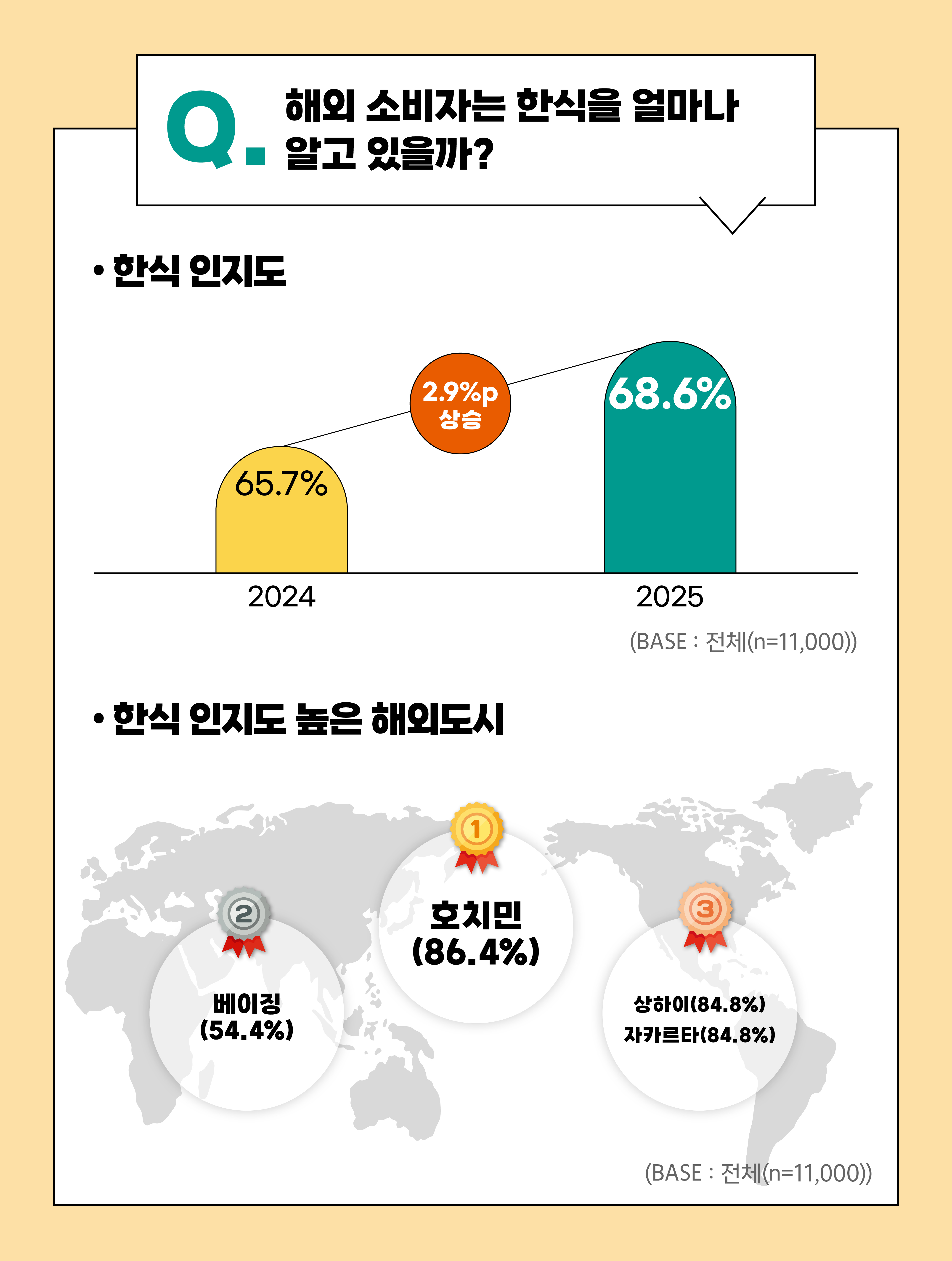 한식 인지도는 68.6%로 전년 대비 2.9%p 상승하며 지난 5년간 꾸준한 증가세를 이어가고 있다. 가장 인지도가 높은 도시는 호치민(86.4%), 베이징(85.4%), 상하이·자카르타(각 84.8%) 순으로 나타났다.