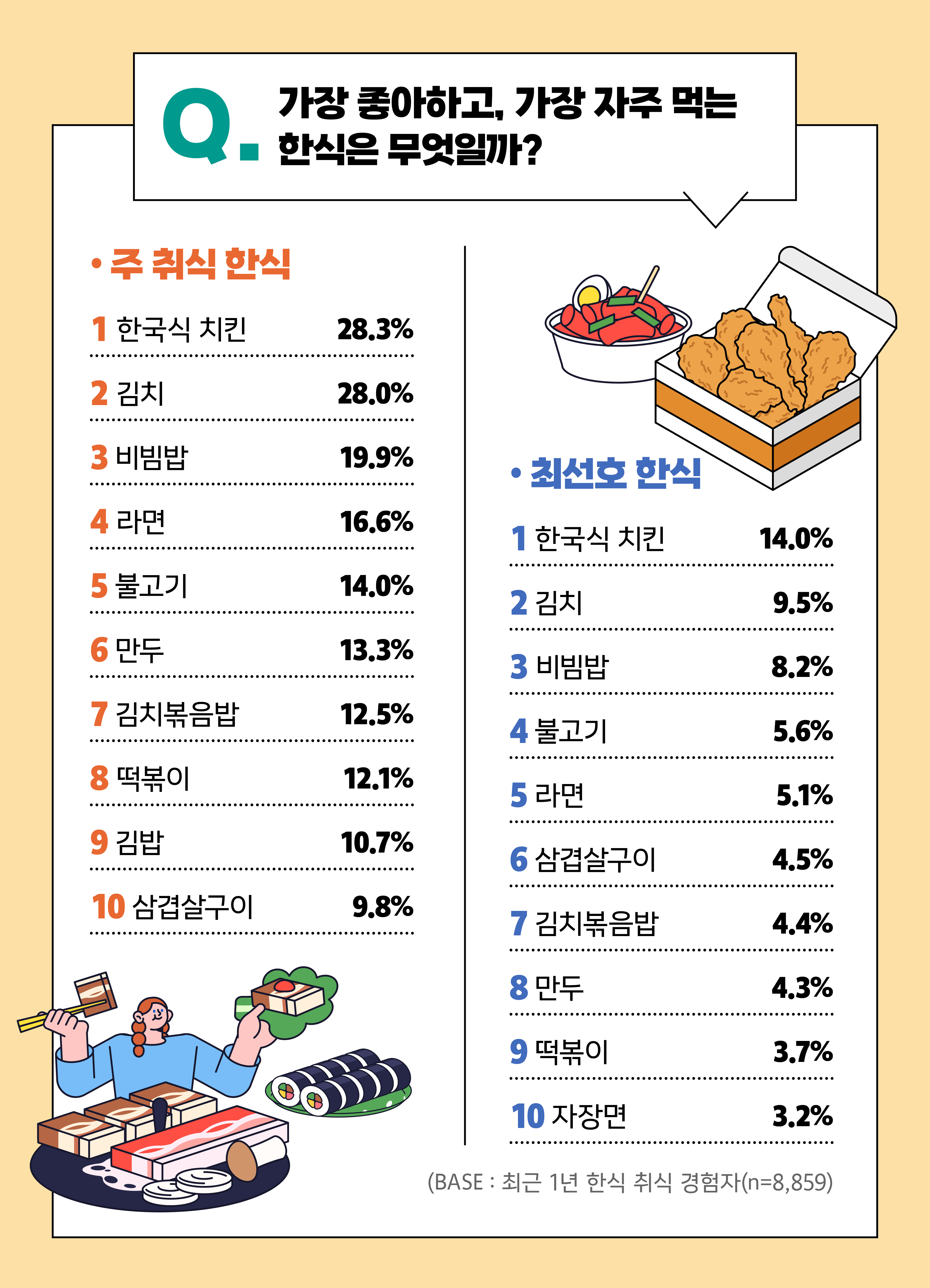 지난 1년 동안 가장 자주 먹은 한식으로는 한국식 치킨(28.3%)이 1위를 차지했다. 이어서 김치(28.0%), 비빔밥(19.9%), 라면(16.6%), 불고기(14.0%)가 뒤를 이었다.
