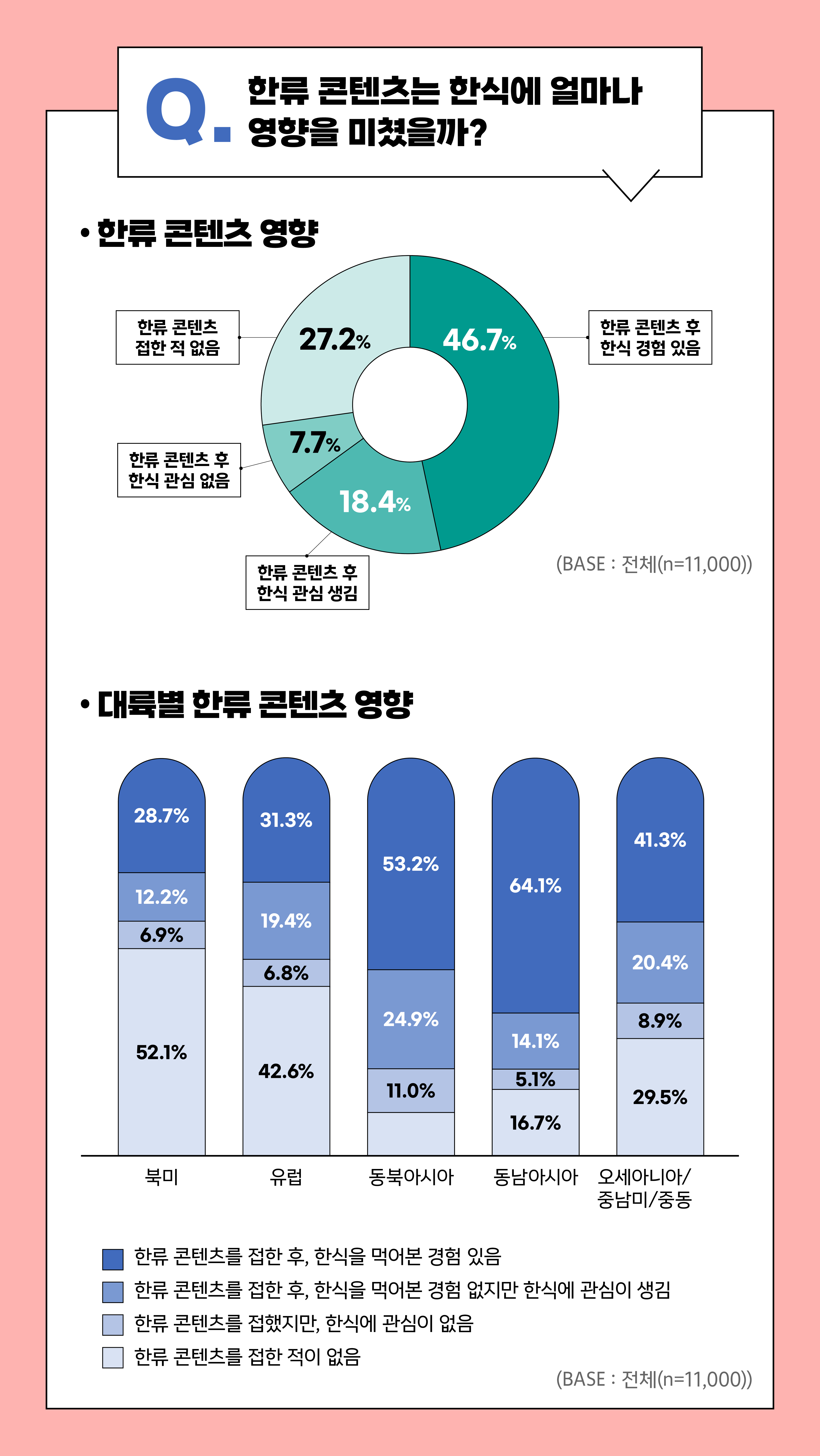 대륙별로는 동남아시아(64.1%)와 동북아시아(53.2%)에서 한류 콘텐츠 기반의 한식 경험이 두드러졌으며, 오세아니아·중남미·중동(41.3%), 유럽(31.3%), 북미(28.7%)가 뒤를 이었다.
