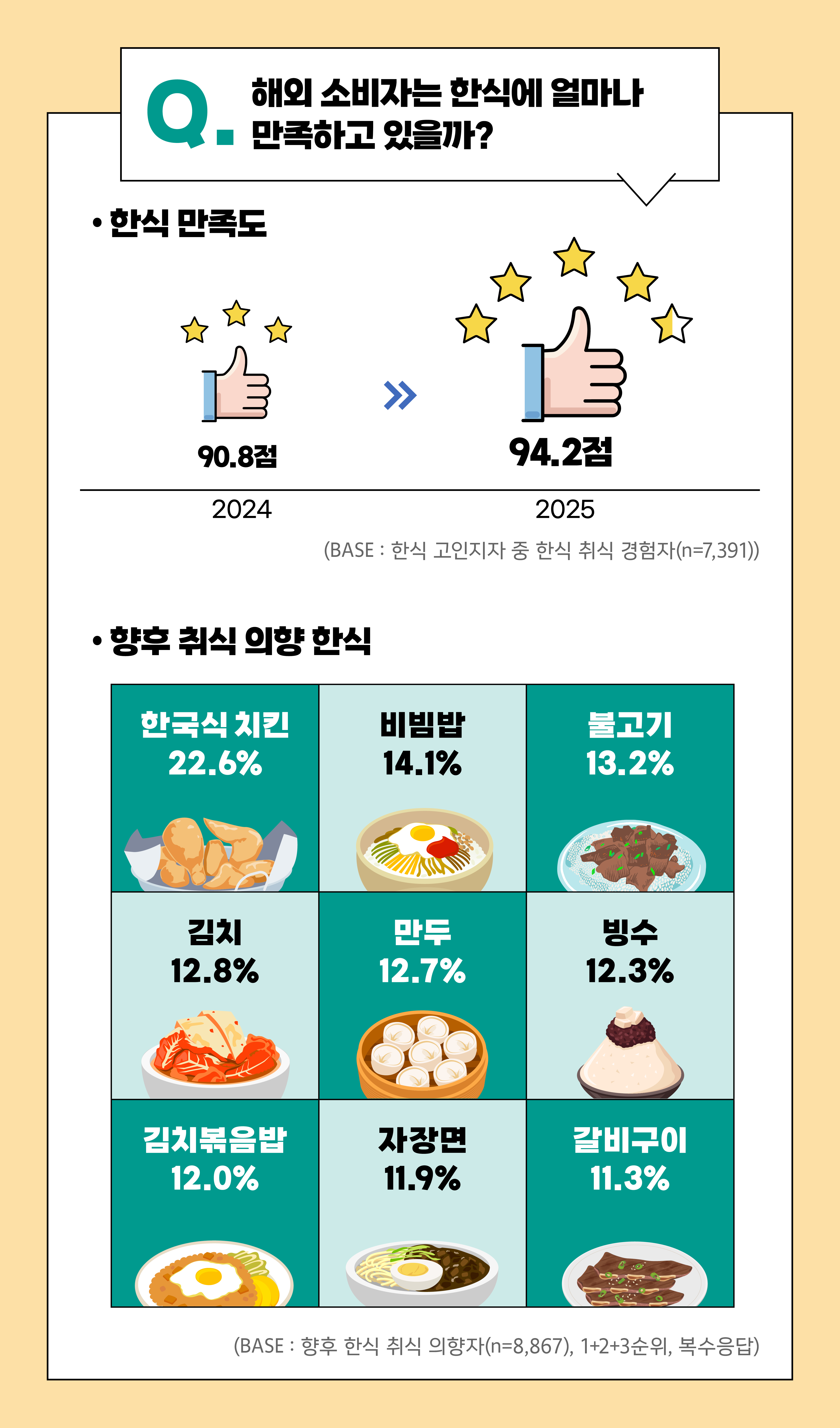 최선호 메뉴 역시 최근 4년간 한국식 치킨과 김치, 비빔밥, 불고기가 꾸준히 상위권을 유지하며 글로벌 스테디셀러로 자리 잡고 있다.