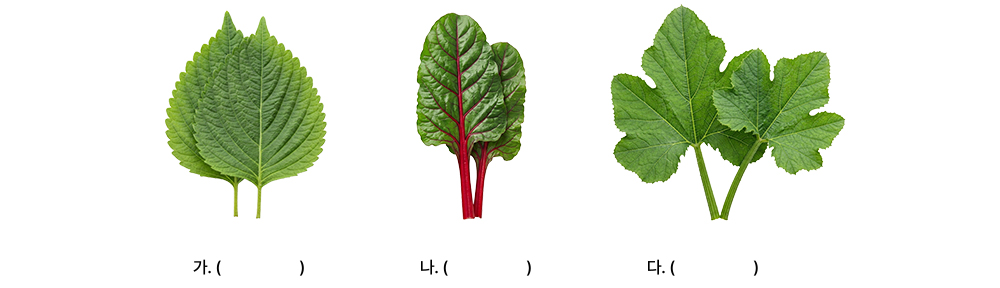 (가) 깻잎: 심장 모양의 잎과 강한 향이 특징으로 고기와 잘 어울린다.
