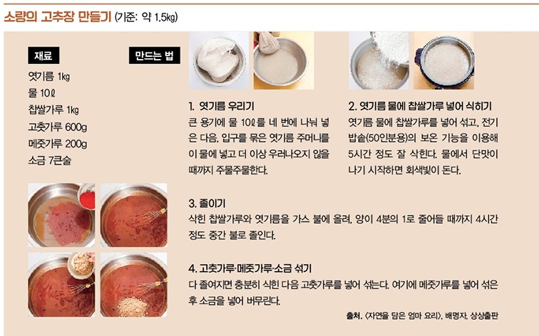 <자연을 담은 엄마 요리>의 저자 배명자 씨는 저서에서 집에 조금씩 만들어 볼 수 있는 적은 양의 고추장 만들기 레시피를 담았다. 이를 소개해 본다.
