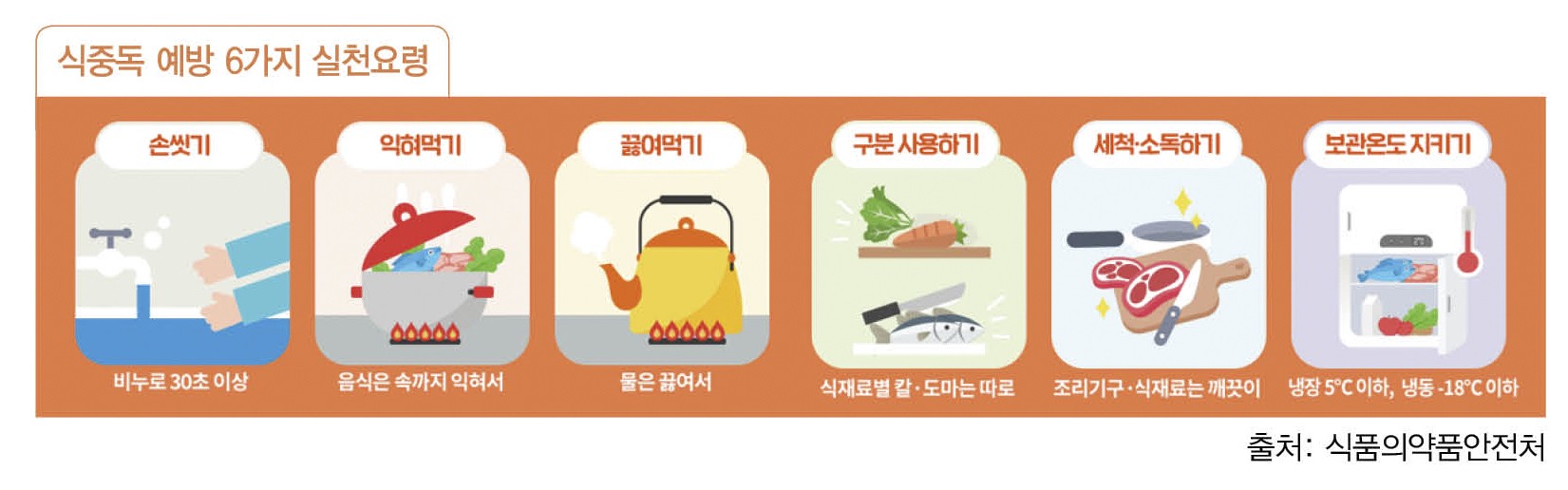 살모넬라균은 열에 매우 약하므로 난류, 육류 조리 시에는 중심온도 75℃에서 1분 이상 충분히 가열‧조리해야 합니다. 칼·도마를 반드시 구분해서 사용하고, 보양식 재료를 만든 후에는 비누 등 세정제를 이용해 흐르는 물에 30초 이상 손을 깨끗하게 씻어야 합니다.