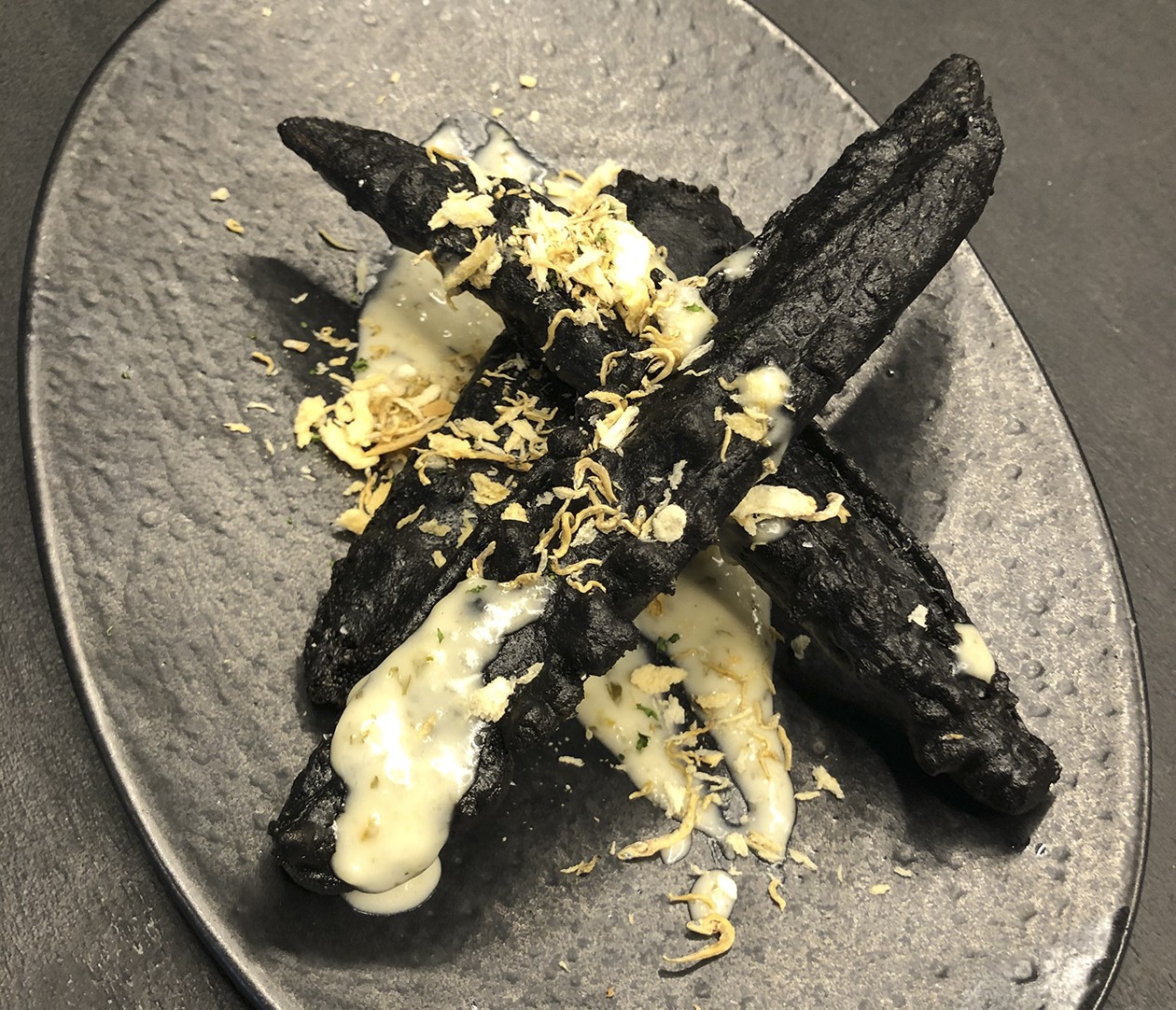 붕장어에 오징어 먹물 옷을 입혀 튀겼다. 유자 타르타르소스를 함께 낸다.