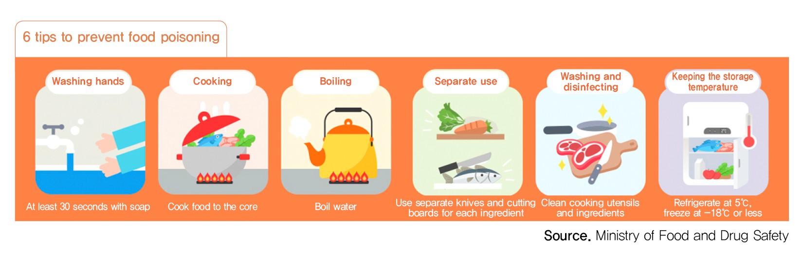 Salmonella bacteria are very weak to heat, so when cooking eggs or meat, it should be sufficiently heated for at least 1 minute at a central temperature of 75℃. Be sure to use separate knives and cutting boards, and wash your hands thoroughly for at least 30 seconds under running water using soap or other detergent after touching the ingredients for nourishing food.