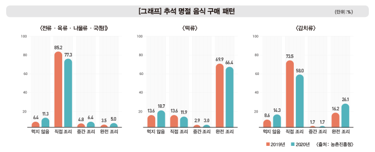 지난해 9월 농촌진흥청은 추석 농식품 구매 패턴을 파악하기 위해 농식품 구매 의향 품목, 구매처, 지출 예상 금액 등을 분석한 결과를 발표하면서 “전반적으로 직접조리보다 반조리 또는 완전조리 식품을 구매한다는 소비자가 늘고 있는 추세”라고 분석했다. 떡을 제외하고 김치, 전, 전·나물·국(탕) 등을 직접 조리한다는 응답 비율이 여전히 높았지만, 그 비중은 줄었다.<그래프 참고> 2016년에 재미있는 뉴스가 보도된 적이 있는데 2016년 한 유통업체의 발표 자료를 인용해 보도한 한 뉴스에 따르면, 2015년 같은 기간과 비교해서 추석 전 2주간 튀김가루와 부침가루의 매출이 각각 25%와 30%가 줄어든 반면 만두, 동그랑땡, 완자, 튀김 등 냉장·냉동 가공식품 매출은 무려 37% 증가했다.