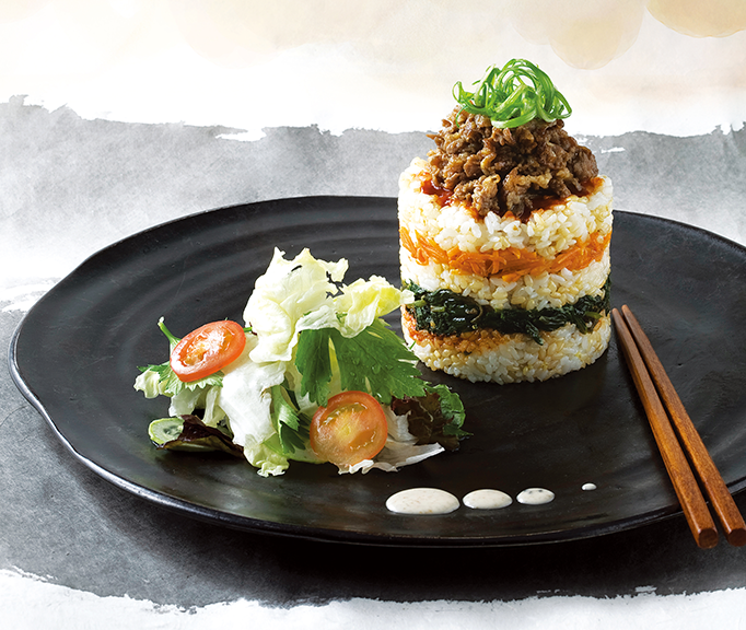 Bulgogi BibimbapEveryone loves the combination of sweet bulgogi and spicy gochujang. If you press it into a round frame and serve it, it's a good dish for guests. It is especially good when introducing our food to foreign guests. Press the brown rice in a circular frame, apply the seasoned red chili paste, and add seasoned sesame leaves, brown rice, stir-fried sliced carrots, and brown rice. Apply gochujang on top, and place bulgogi on it. Place the bulgogi bibimbap and salad greens on a plate, and make and apply perilla seed dressing.