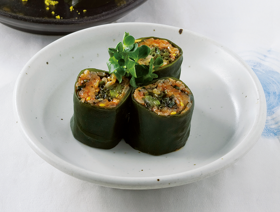 It is made by wrapping bibimbap in seaweed and kelp to make it easy to eat in one bite. Seaweed is rich in minerals, such as iodine, iron, and potassium, which supplement nutritional imbalances. Boil seaweed, kelp, and tot (brown sea vegetable) in boiling water, blanch slightly, and rinse in cold water to drain. Spread it on the kimbap net, spread the bibimbap thinly, and add the sliced cucumber, tot, and flying fish roe, and roll it like kimbap. Cut into bite-sized pieces, put in a bowl, and top with radish sprouts and egg yolk powder. Serve with chogochujang (sweet and sour red chili paste). You can also use edible seaweeds, such as gulfweed, tot, seaweed fulvescens, and sea staghorn.