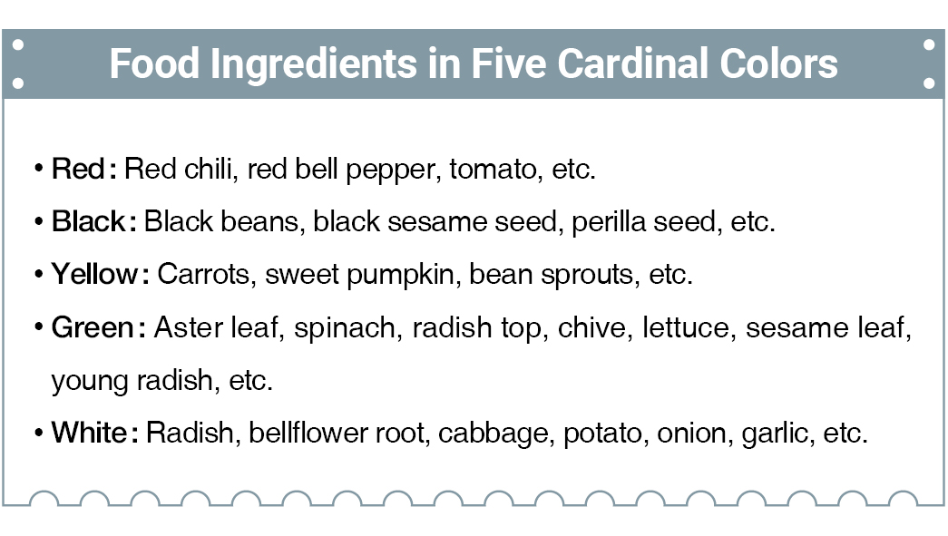 Bibimbap contains all five colors: white, green, red, yellow, and black. The five colors are based on the traditional Oriental yin-yang and the five elements theory about the energy of yin and yang on being created and becoming heaven and earth, and, by extension, creating the five elements of fire, water, earth, wood, and gold.