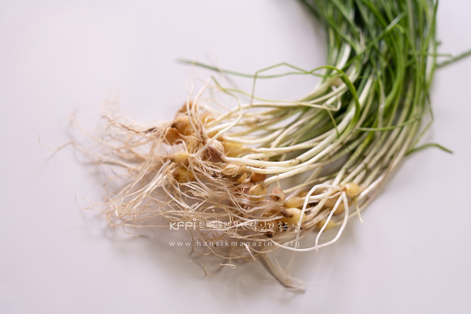 Dallae has been known as a tonic from old times. It is said that it is good for anorexia and agonism with its rich vitamin C and calcium, and its vitamin A strengthens the immune system. Trimming this is tricky, but cooking is relatively simple. Dallaejang(wild chive sauce) itself - chopping the trimmed dallae mixing with sugar, garlic, and sesame in soy sauce adding a small amount of sesame oil - can be an excellent side dish. It is also good to make fresh kimchi and then take it with tofu or muk(jelly) or boiled pork slices and if you have enough amount, it is also OK to make kimchi with it. Someone griddles pancakes to eat with it, however, it is recommended to eat it raw as it has rich vitamin C.
