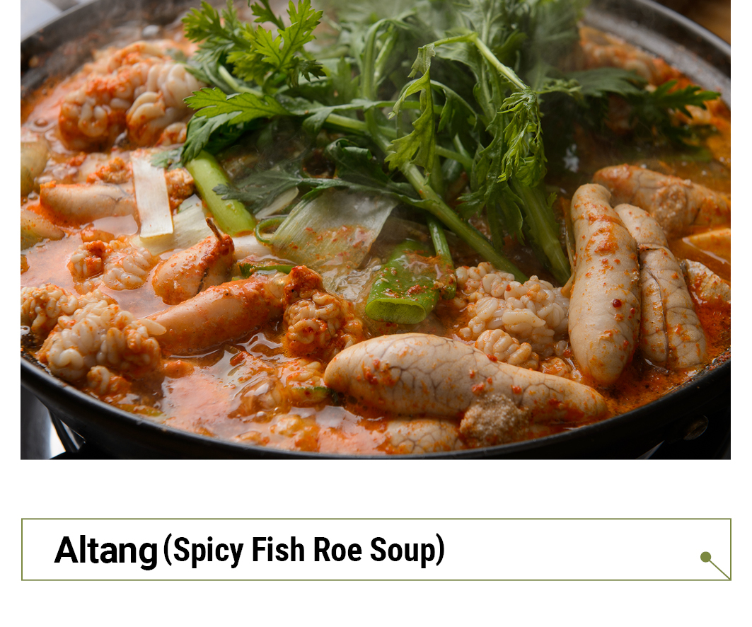 Myeolchi(anchovies) is an essential ingredient used to make the basic broth of guk and tang at home. The broth, which is filled with the flavor of the sea, enhances the taste of a dish. In fact, to make guk and tang, fish or seafood living in rivers and seas were used often. There are tang dishes using sea fish or roes, such as chueotang(loach soup), minmul maewoontang(spicy freshwater fish stew), daegutang(codfish soup), mineotang(croaker stew), agwitang(monkfish soup), altang(spicy fish roe soup), etc. Also, like gulgukbap(oyster and rice soup) eaten in the winter, many types of seafood were used.