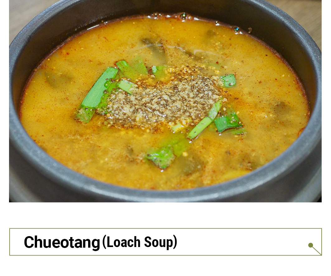 400 g loach, 150 g boiled taro stem, 100 g boiled kimchi cabbage leaves, 50 g boiled bracken, 50 g mung bean sprouts, 30 g chives, 35 g green onion, 15 g green pepper, 2L water, 2 tbsp soybean paste, pumpkin leaf, Korean mint leaf, soy sauce, salt, chopi(Korean pepper) powder