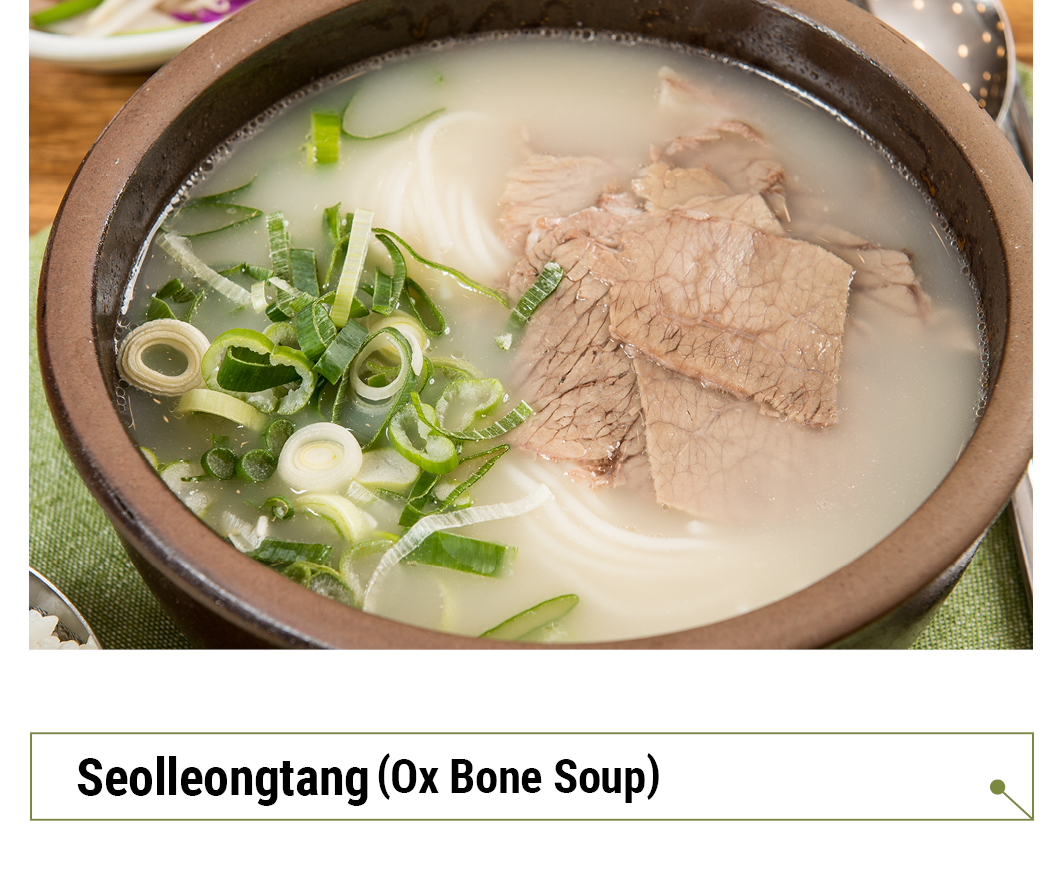 Meat is the most used ingredient for guk and tang. Meat, including beef, pork, and chicken, is used to make the broth for guk and tang, and the bones were used as ingredients as well. It doesn't stop there. The intestines and even seonji made with blood also became ingredients for guk. Seolleongtang and gomtang using beef are the most well-known dishes, but dwaejigukbap and sundaegukbap using pork or its by-products, and dakgomtang using chicken have been loved by many for a long time.
