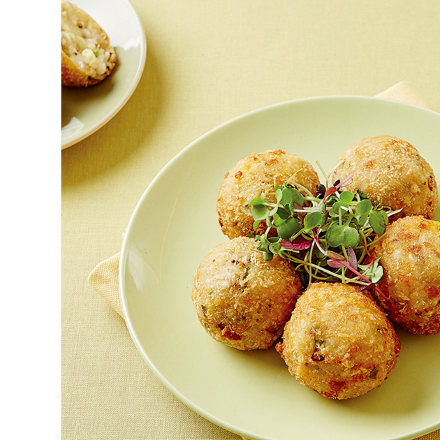 ⑤ 밥을 동글 납작하게 편 뒤 모차렐라치즈를 넣고 동그랗게 빚어 밀가루, 달걀물, 허브 가루를 섞은 빵가루 순으로 튀김옷을 입힌다.